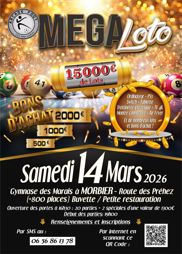 Samedi 14 mars 2026 au Gymnase des Marais à Morbier. Plus de 15 000 € de lots à gagner : bons d’achats 2 000 € ,1000 €,500€,etc…Valables dans commerces régionaux, PC portable, TV 4K, consoles Switch et PS5, trottinette électrique . 750 places. 20 parties + 2 spéciales. Ouverture à 16h30 et début 19h. Buffet et buvette. Réservation conseillée. Tarifs : 1 carton 12 €, 3 pour 30 €, 6 pour 40 €, 12 pour 50 €. Infos et réservations : 06 56 86 13 78 ou HelloAsso.