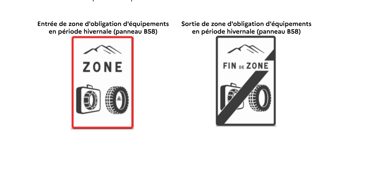 Depuis le 1er novembre 2021, une nouvelle signalisation a été implantée sur les routes. Elle indique les entrées et les sorties de zones de montagne où l’obligation d’équipements hivernaux s’applique.
