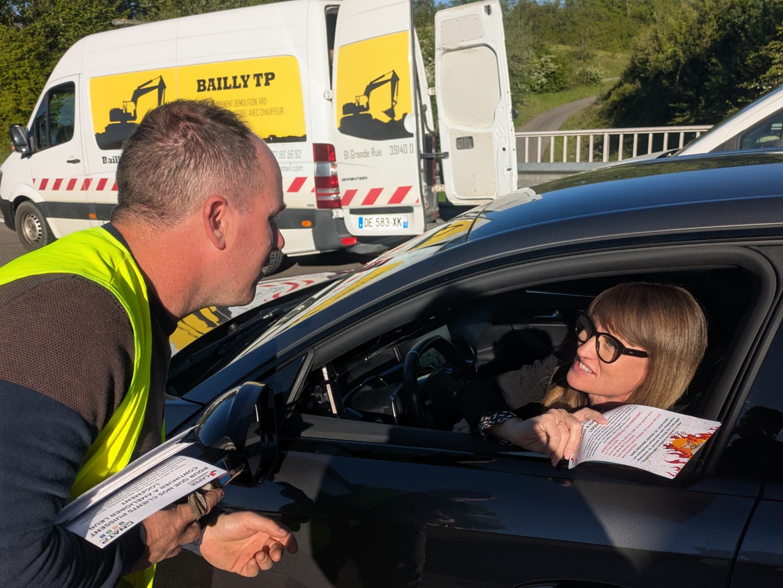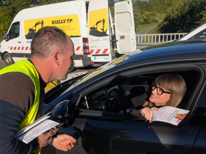 Les artisans distribuaient des flyers aux véhicules ralentis.