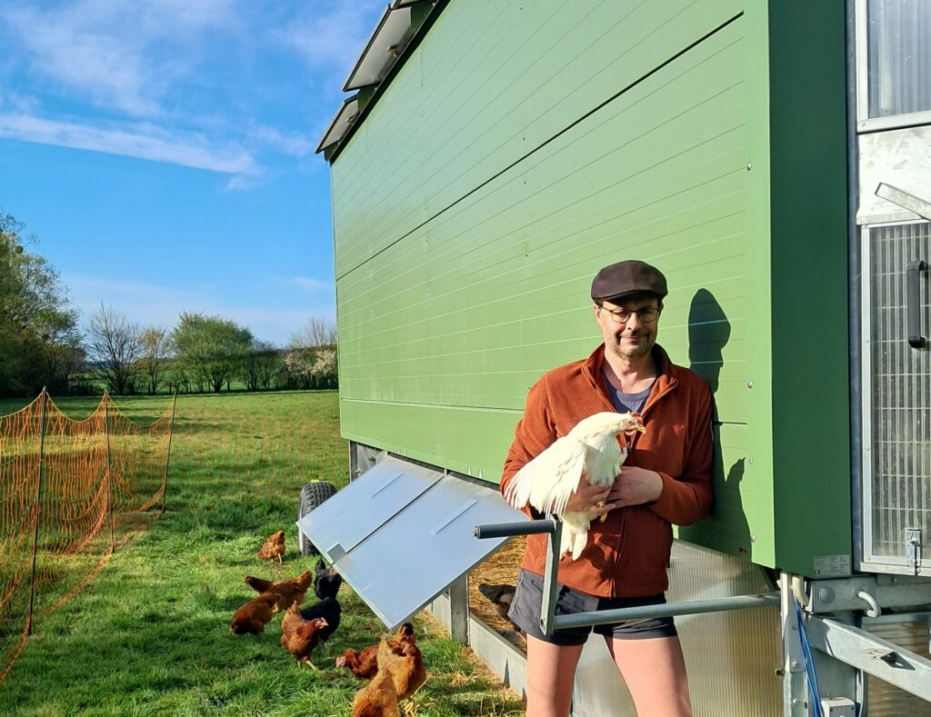 Après plus de quinze ans à élever poules, moutons et cochons pour sa famille, et fort de trente années d’expérience dans l’industrie automobile, il a souhaité donner un nouveau sens à son activité. De cette réflexion est né un poulailler mobile, conçu pour produire des œufs de qualité dans le respect du vivant, tout en contribuant à une forme de sécurité alimentaire.