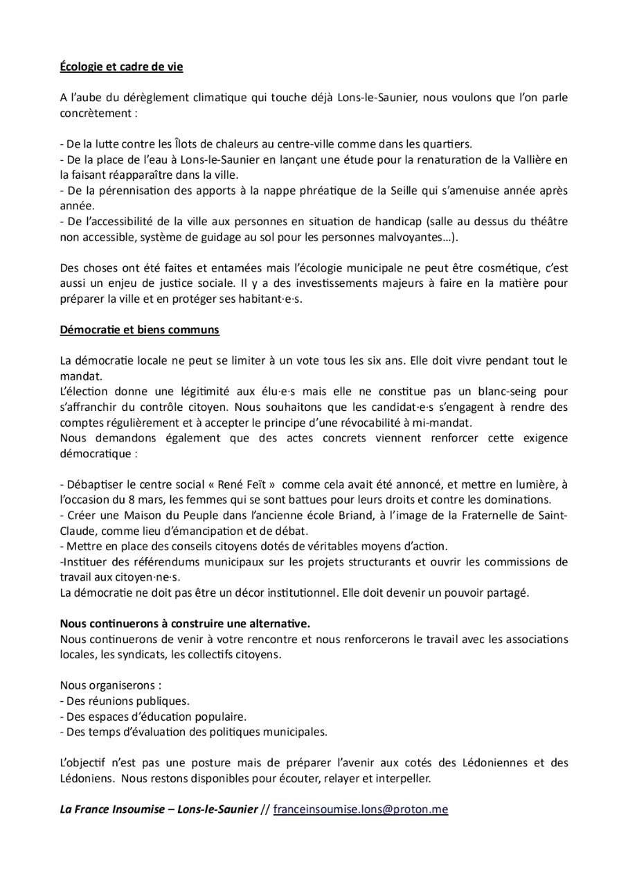 Dans ce texte, les Insoumis disent vouloir continuer à peser dans le débat municipal malgré leur absence dans la compétition électorale. Ils évoquent un climat politique local qu’ils jugent marqué par des attaques visant leur mouvement et affirment ne pas vouloir se limiter à une « liste de témoignage ». Plusieurs priorités locales sont ainsi mises en avant, notamment la défense des services publics, la transition écologique ou encore le renforcement de la démocratie locale. Le mouvement propose par exemple la mise en place de conseils citoyens dotés de moyens d’action et l’organisation de référendums municipaux sur les projets structurants.