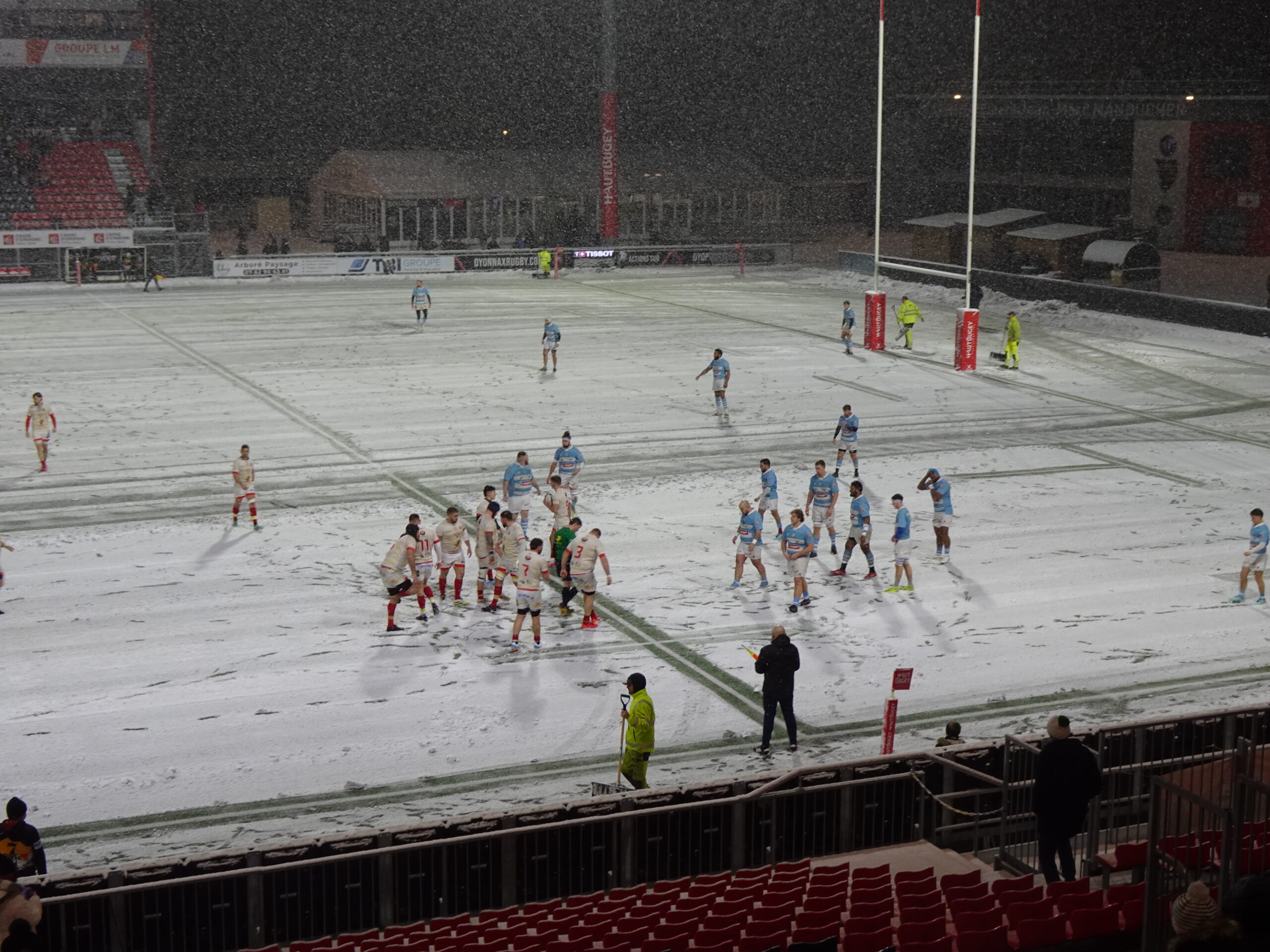 Les lumières du stade Charles-Mathon étaient allumées ce samedi 10 janvier 2026 en fin d’après-midi, alors qu’il neigeait sur la ville. Et pour cause : un après-midi de rugby était programmé sur la pelouse oyonnaxienne, déjà théâtre la veille d’une joute de Pro D2 entre Oyonnax Rugby et l’US Carcassonne, remportée largement par le XV local sur le score sans appel de 33 à 7.