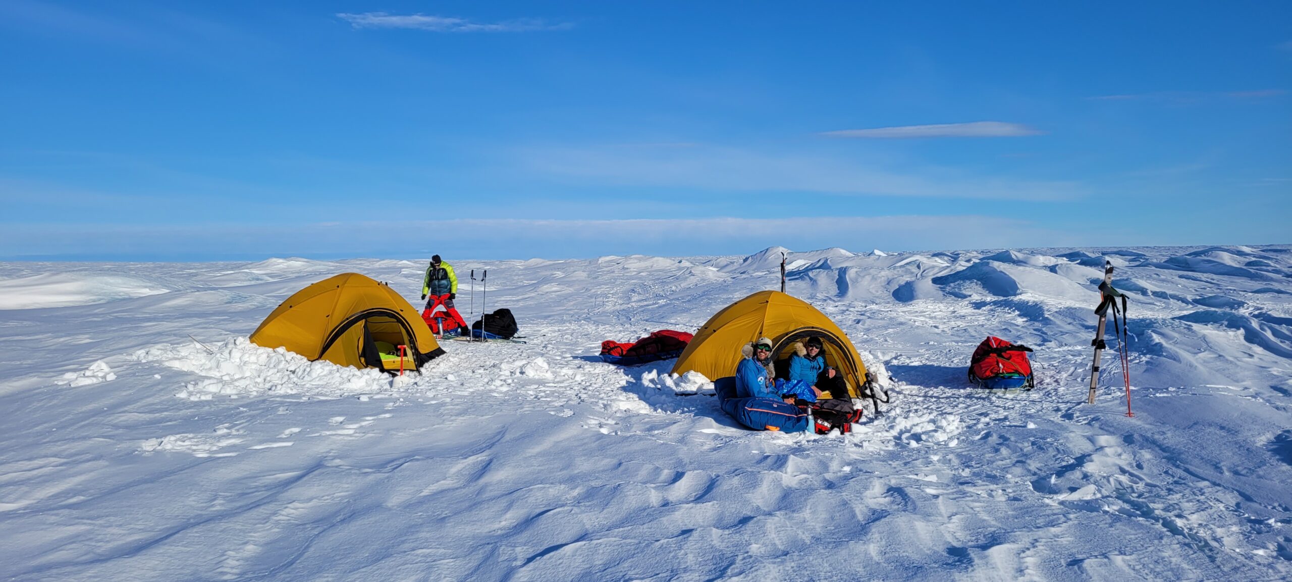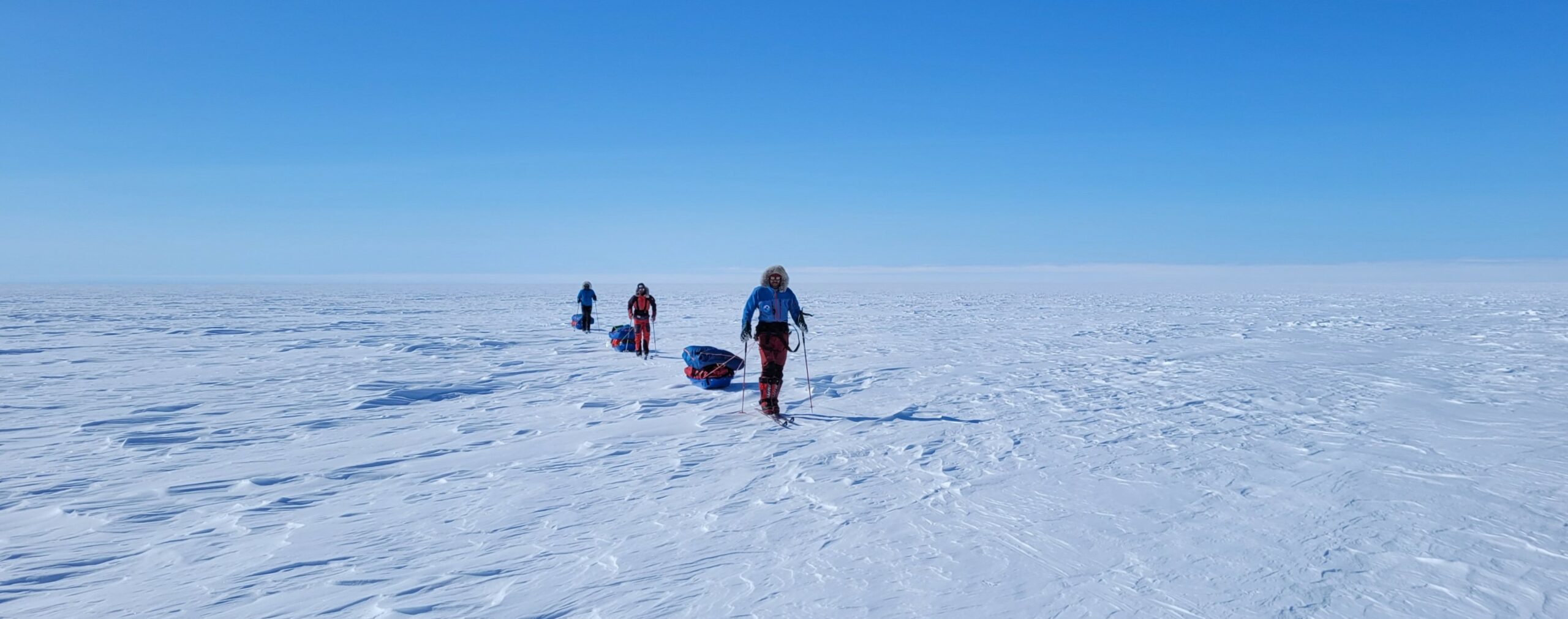 Les images sont parfois magnifiques lorsque la météo le permet. Mais les conditions peuvent être sévères : chacun doit tirer une pulka, traîneau contenant vivres et matériel, dont le poids peut dépasser les cent kilos. Au sud du Groenland, près de l’ancienne station américaine abandonnée DYE-2, l’isolement est total.