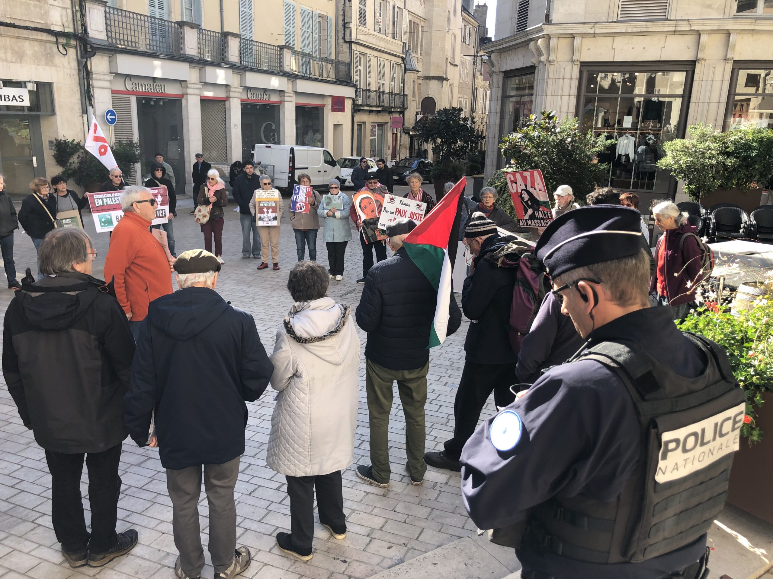 Samedi matin à 11h30, près de 70 adhérents ou sympathisants du collectif se sont rassemblés Place du 8 mai, comme il en est désormais coutume toutes les deux semaines depuis un an. Au vu du climat de tension actuel, la manifestation était particulièrement encadrée par les forces de l’ordre…