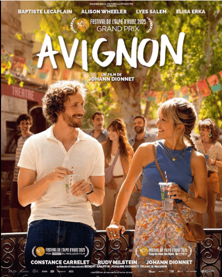 Cette affiche met en avant le film Avignon, réalisé par Johann Dionnet et récompensé du Grand Prix au Festival de l’Alpe d’Huez 2025. On y voit les acteurs Constance Carrellet et Johann Dionnet dans une ambiance festive, avec des décorations colorées. Les noms des acteurs Baptiste Lecaplain, Alison Wheeler, Lyes Salem et Elisa Erka figurent également sur l’affiche.