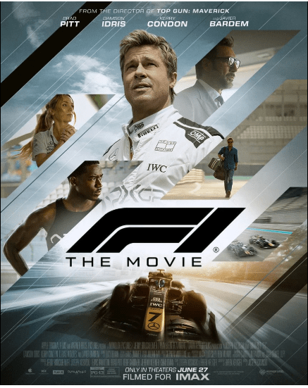 Affiche promotionnelle du film “F1 The Movie”, mettant en vedette Brad Pitt, Idris Elba, Kerry Condon et Javier Bardem. Réalisé par le metteur en scène de “Top Gun: Maverick”, le film plonge dans l’univers palpitant de la Formule 1. Disponible en salles IMAX à partir du 27 juin.
