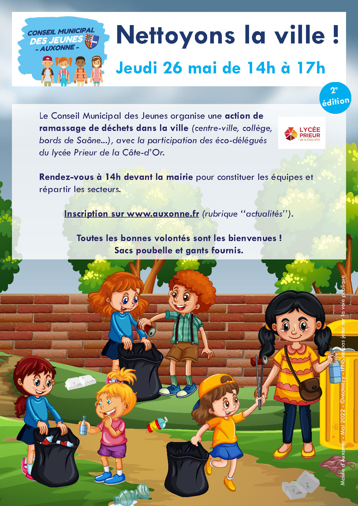 Le Conseil Municipal des Jeunes d’Auxonne organise une action de ramassage de déchets dans la ville (centre-ville, collège, bords de Saône…), avec la participation des éco-délégués du Lycée Prieur de la Côte d’Or